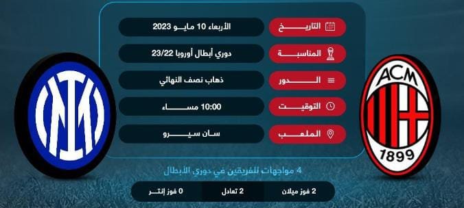 يواجه ميلان نظيره إنتر ميلان في مباراة الذهاب المرتقبة من نصف نهائي دوري أبطال أوروبا.
