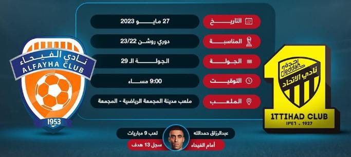 يحل الفريق الأول لكرة القدم بنادي الاتحاد اليوم السبت ضيفاً على الفيحاء وذلك ضمن مباريات الجولة 29 من دوري روشن السعودي.