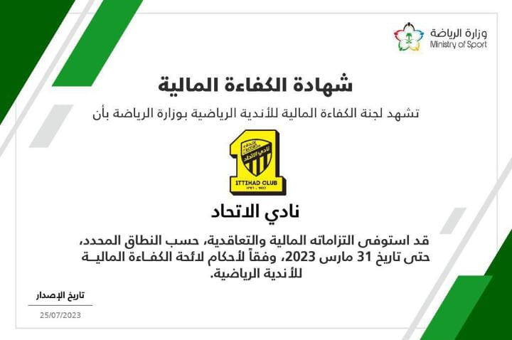 وجاء حصول الاتحاد على الشهادة “بعد الوفاء بالتزاماته التعاقديه والمالية حسب النطاق المحدد من قبل اللجنة حتى تاريخ 31 مارس 2023م وفقاً لأحكام لائحة الكفاءة المالية للأندية الرياضية.