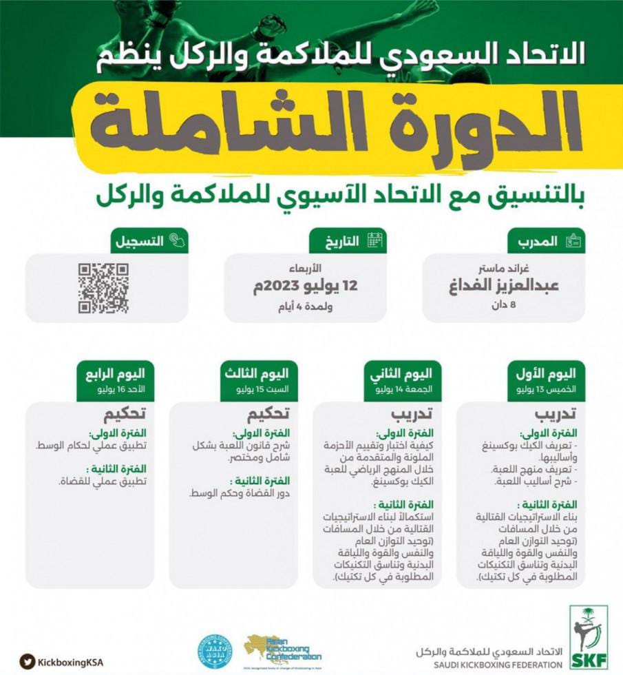 ينظم الاتحاد السعودي للملاكمة والركل، بالتعاون مع الاتحاد الآسيوي دورة تأهيلية شاملة لتجاوز المعايير الفنية للمدربين والحكام والحصول على تصنيف الاتحاد السعودي للملاكمة والركل، من 12 يوليو الجاري لمدة 4 أيام.