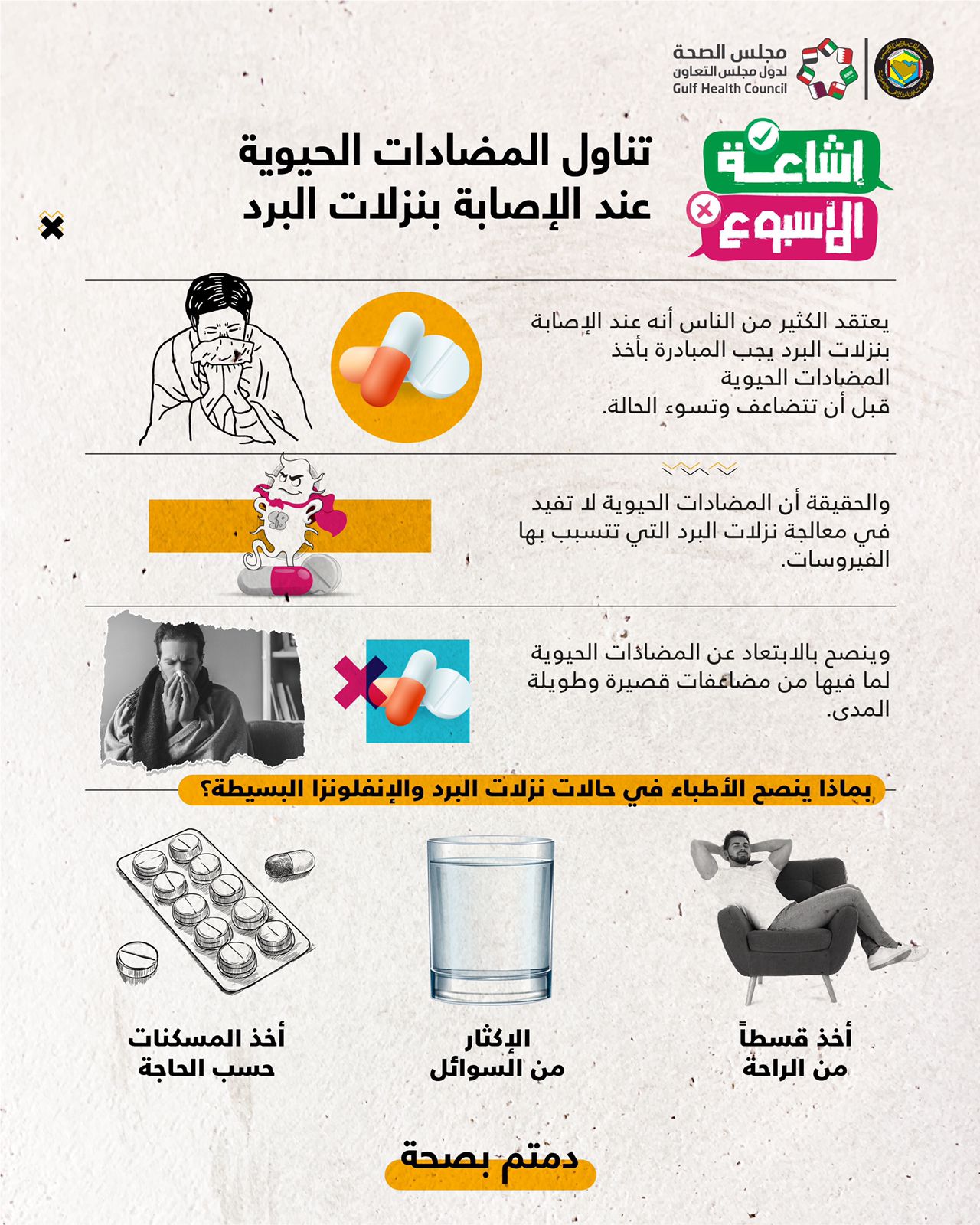 نوه مجلس الصحة لدول مجلس التعاون الخليجي عبر حساباته الرسميه على وسائل التواصل الاجتماعي من خلال سلسلته التوعوية (إشاعة الاسبوع) أن ضرورة تناول المضادات الحيوية عند الإصابة بنزلات البرد إشاعة، حيث يعتقد الكثير من الناس أنه عن إصابته بنزلات البرد يجب عليه المبادرة بأخذ المضادات الحيوية قبل ان تتضاعف وتسوء الحالة.