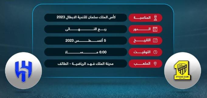 يلاقي الفريق الأول لكرة القدم بنادي الاتحاد السعودي اليوم السبت نظيره الهلال السعودي في ربع نهائي كأس الملك سلمان للأندية الأبطال.