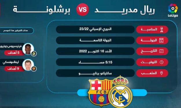 وستُقام مباراة كلاسيكو الأرض بين ريال مدريد وبرشلونة، في الرابعة والربع عصر اليوم الأحد، ضمن منافسات الجولة التاسعة من الدوري الإسباني “الليجا”.