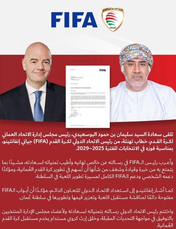 واختتم رئيس الاتحاد الدولي رسالته بتمنياته لسعادته ولأعضاء مجلس الإدارة المنتخبين بالتوفيق في مواجهة التحديات المقبلة، وخلق إرث كروي مستدام يخدم مستقبل كرة القدم العُمانية لكرة القدم (FIFA) جياني إنفانتينو، بمناسبة فوزه في الانتخابات للفترة 2025–2029.