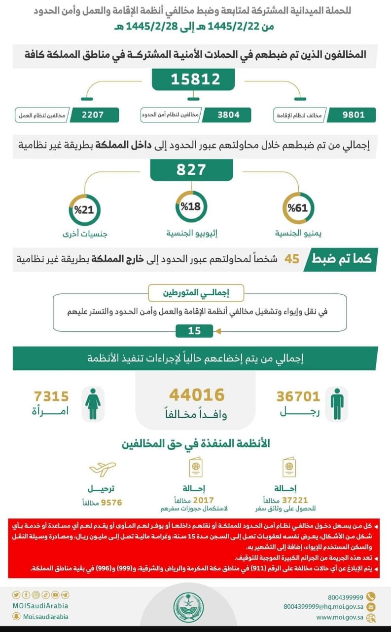 أولاً: بلغ إجمالي المخالفين الذين تم ضبطهم بالحملات الميدانية الأمنية المشتركة في مناطق المملكة كافة ( 15812 ) مخالفًا، منهم ( 9801 ) مخالفاً لنظام الإقامة، و( 3804 ) مخالفين لنظام أمن الحدود، و( 2207 ) مخالفين لنظام العمل.
