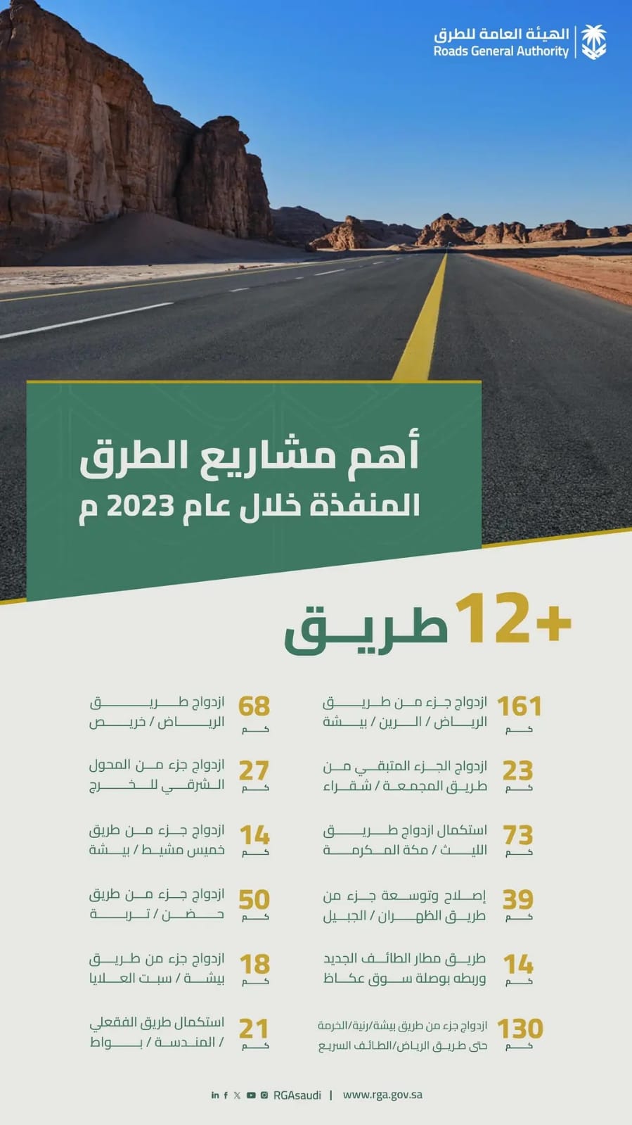 شهد قطاع الطرق في المملكة حراكًا كبيراً وحيويًا خلال عام 2023، نظير المشاريع التي تم تنفيذها في مناطق مختلفة من المملكة، وبطول إجمالي يقارب 2400 كم/مسار، ستسهم في دعم النهضة التي تعيشها المملكة، وتحقيق أهداف إستراتيجية قطاع الطرق .