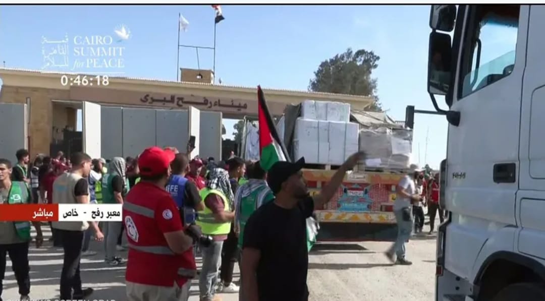 وعرض التلفزيون المصري لقطات تظهر دخول شاحنات إلى المنطقة الحدودية لمعبر رفح من الجانب المصري.