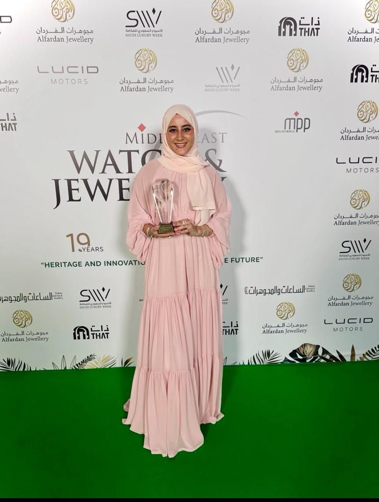 وأعربت المصممة السعودية الواعدة عن سعادتها بحصولها على هذه الجائزة المرموقة، وصرحت قائلة : ” الفوز بجائزة ” أفضل مصممة مجوهرات بالشرق الأوسط” يعد شرفاً كبيراً بالنسبة لي، ودفعة قوية نحو الأمام لمساعدتي على تحقيق حلمي ومتابعة شغفي في عالم المجوهرات.”
