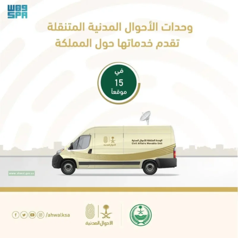 وحدات الأحوال المدنية المتنقلة تقدم خدماتها في 15 موقعاً حول المملكة