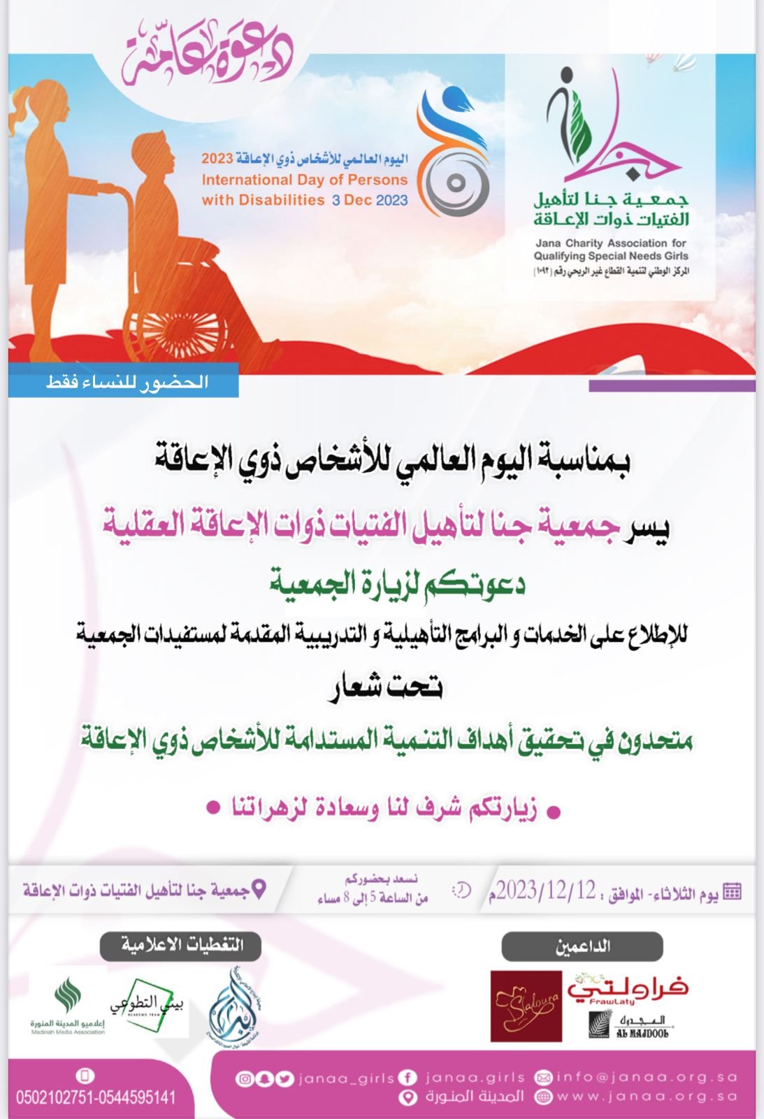 احتفلت جمعية جنا لتأهيل الفتيات ذوات الإعاقة العقلية ، بمناسبة اليوم العالمي للأشخاص ذوي الإعاقة على مدار يومان .