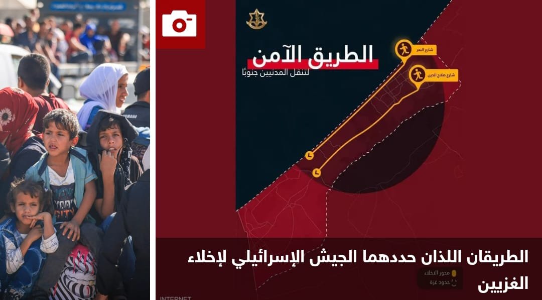 أعلن الجيش الإسرائيلي، السبت، أنه حدد لسكان مدينة غزة طريقين لمغادرة المدينة جنوبا لساعات محدودة، وهو أمر وصفته الأمم المتحدة بأنه “جريمة ضد الإنسانية”.