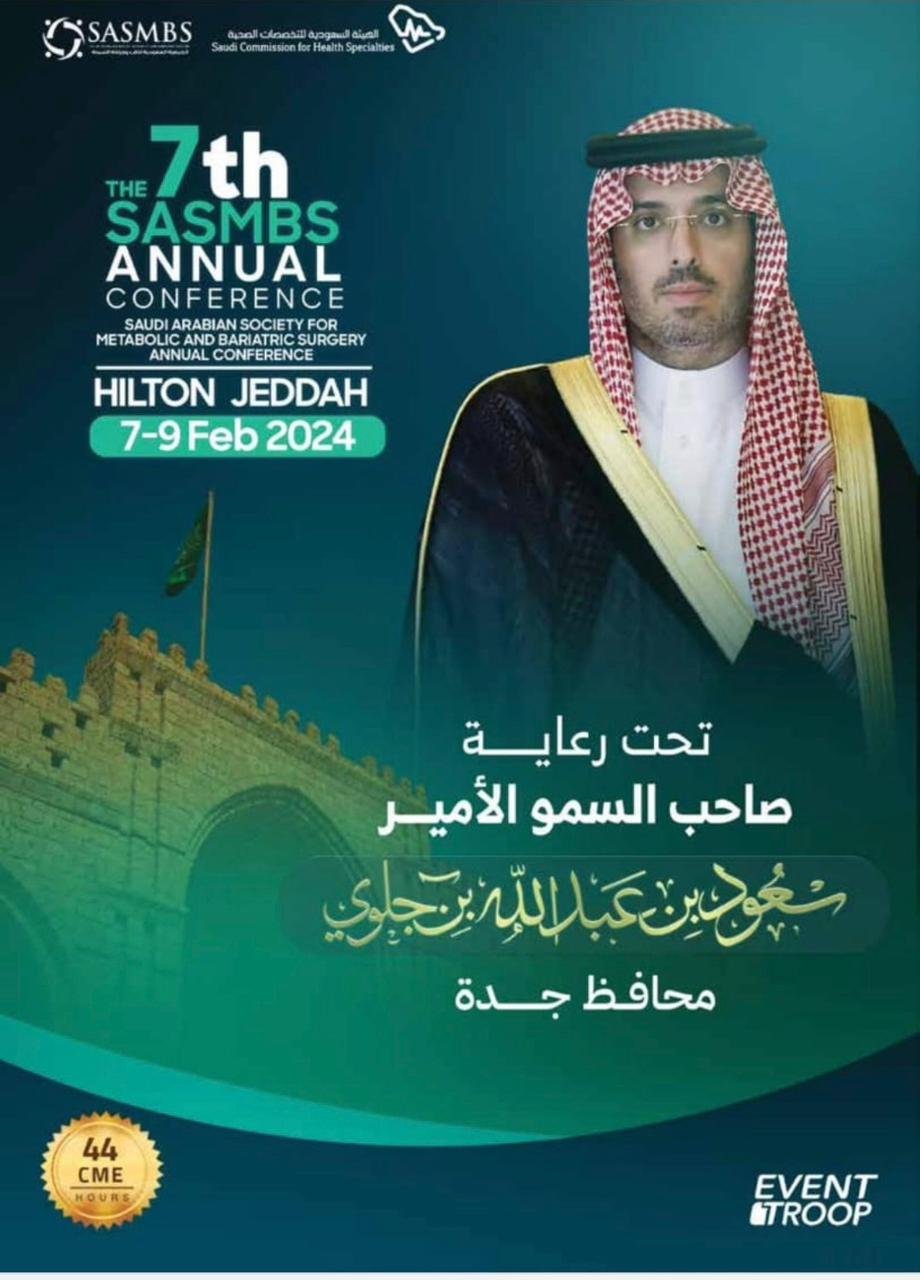 تنظم الجمعية السعودية للجراحة السمنه بالمملكة العربية السعودية، المؤتمر العلمي السابع لجراحة وطب السمنة، برعاية صاحب السمو الأمير سعود بن عبدالله بن جلوي محافظ جده ، من 7-9 /2/ 2024م، في قاعة المؤتمرات بفندق هيلتون بمحافظة جدة.