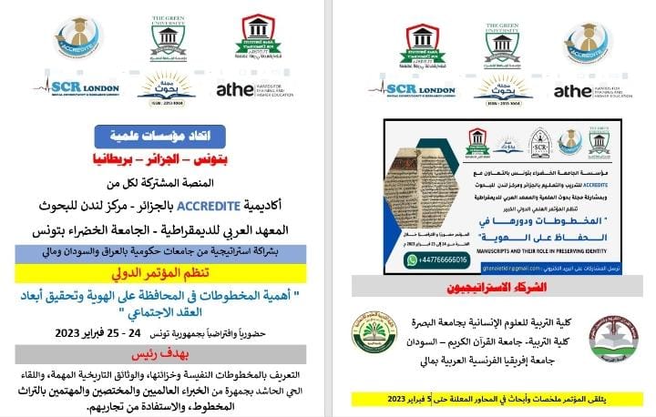 أعلنت المنصة المشتركة للمؤتمر الدولي المعنون بـ “أهمية المخطوطات في المحافظة على الهوية وتحقيق أبعاد العقد الإجتماعي” الذي تنظمه إتحاد مؤسسات علمية بتونس والجزائر وبريطانيا حضورياً وافتراضياً بجمهورية تونس 24 – 25 فبراير 2023 ، تأجيل آجال تسلم الملخصات العلمية للراغبين في المشاركة إلى موعد غايته الخامس من فبراير المقبل.