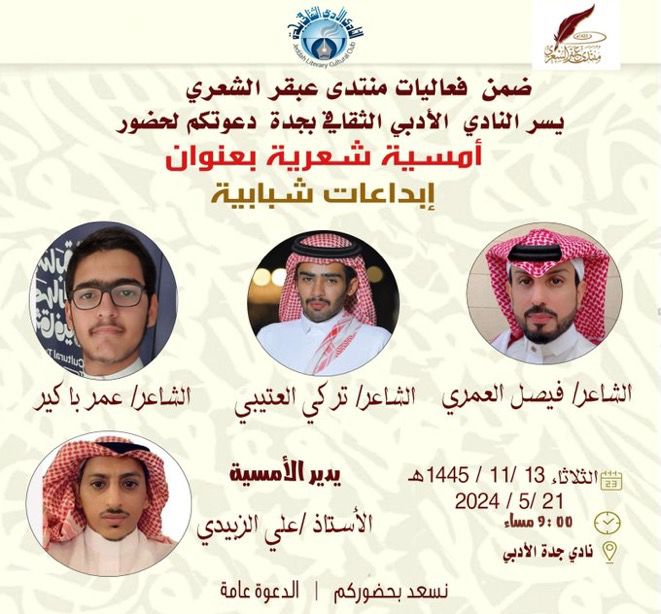 بقيم منتدى عبقر الشعري بالنادي الأدبي بجدة أمسيةشعرية ( إبداعات شبابية) يشارك فبها الشعراء فيصل العمري وتركي العتيبي وعمر باكير
