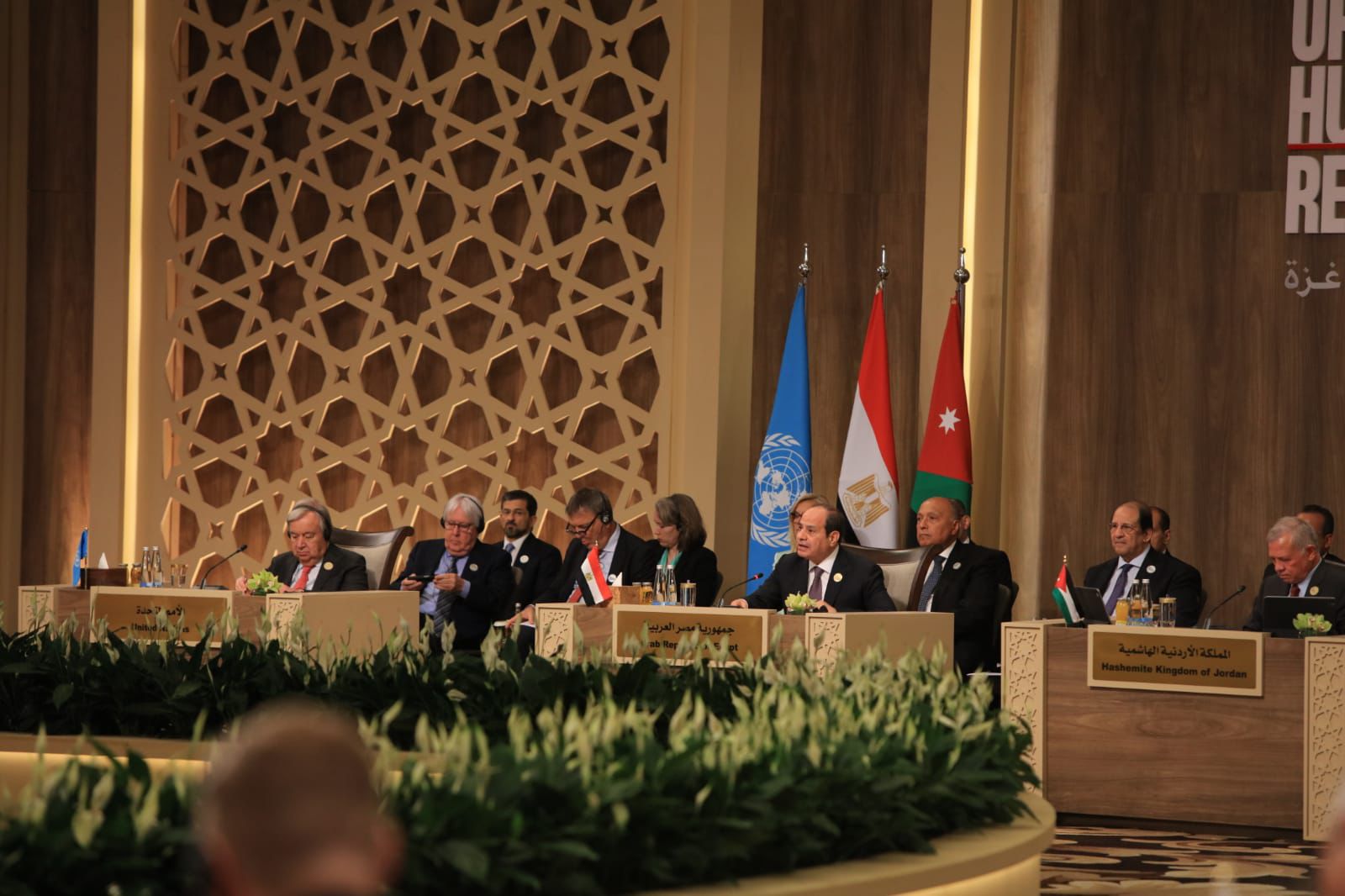 قال الرئيس السيسى أتوجه بدايةً بالشُكر.. للمملكة الأردنية الشقيقة على استضافة هذا المؤتمر المهم.. وأعرب عن التقدير.. لجلالة الملك عبدالله الثاني.. ومعالي سكرتير عام للأمم المتحدة.. لجهودهما نحو إنهاء الحرب على غزة.. ومحاولة تخفيف الأعباء الإنسانية الفادحة الناجمة عنها.. كما أتوجه بالشكر.. إلى جميع الدول.. التي استجابت للدعوة لحضور هذا المؤتمر المشترك.. الذي تشرف مصر بالرئاسة المشتركة له.