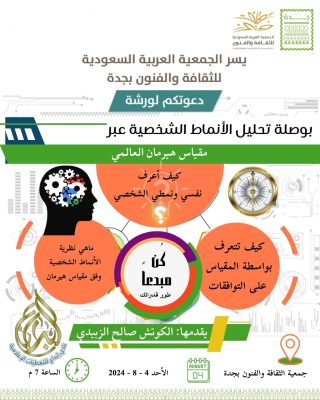 برعاية واشراف جمعية الثقافة والفنون بجدة.. تقام ورشة بوصلة تحليل الأنماط الشخصية عبر مقياس هيرمان العالمي والتي يقدمها الدكتور صالح الزبيدي.. اليوم الأحد 4/8/2024 الساعة السابعة مساء بمقر جمعية الثقافة والفنون بجدة