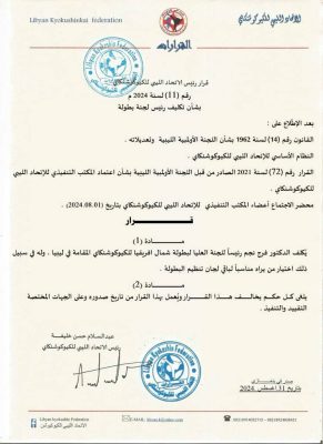 أصدر رئيس الاتحاد الليبي لليكوكوشنكاي عبدالسلام حسن خليفة قرار رقم “11” للسنة 20240 بشأن تكليف الدكتور فرج نجم برئاسة اللجنة العليا للبطولة افريقيا لليكوكوشنكاي المقامة فى ليبيا على أن يختار مايراه مناسبا لباقي اللجان من أجل تنظيم البطولة ،