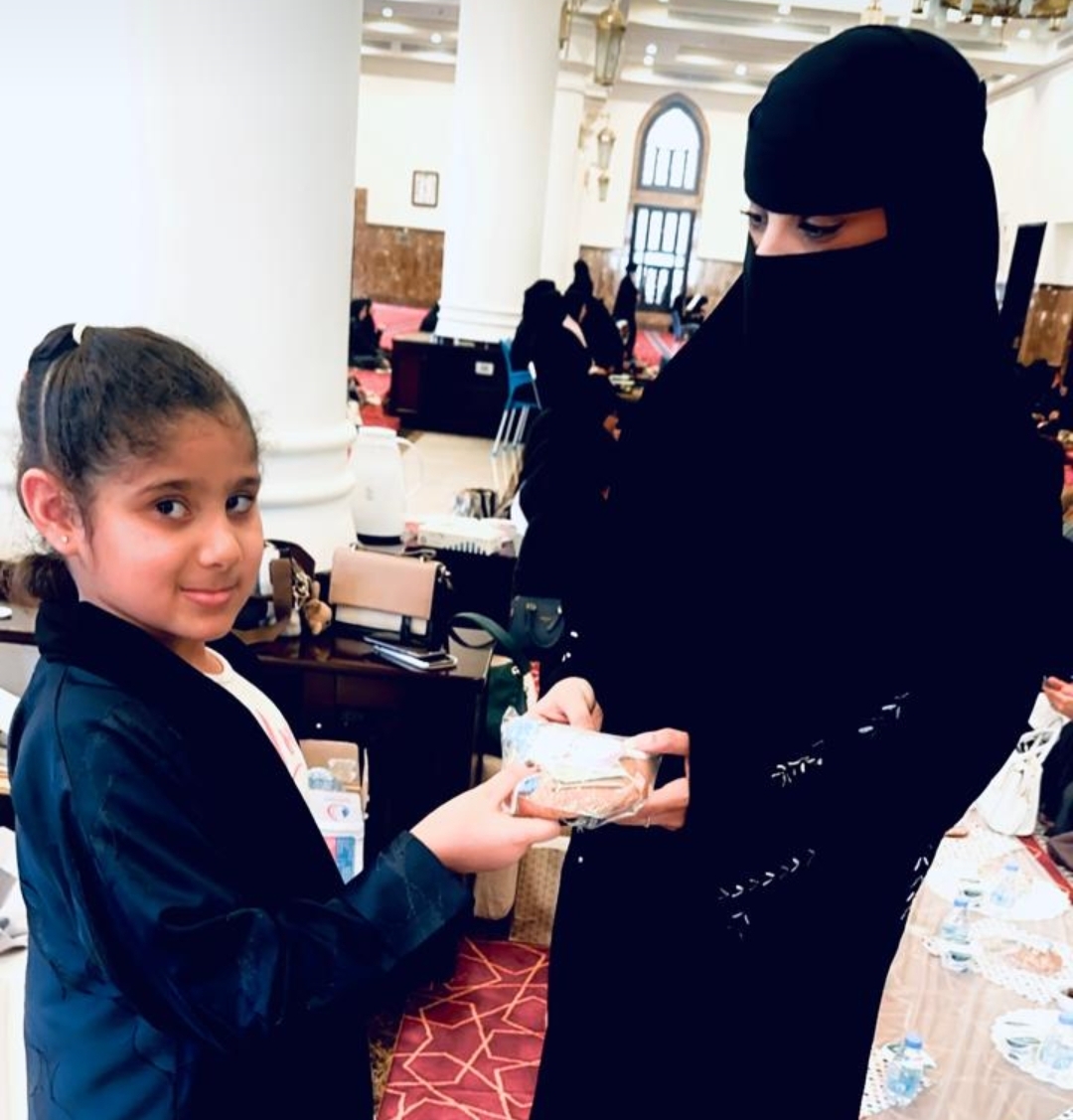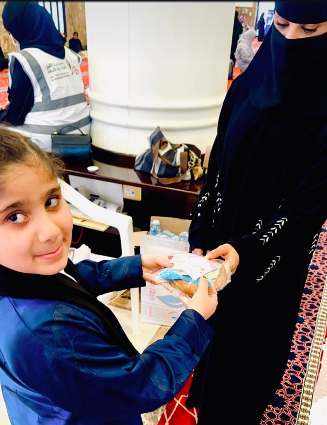 في أجواء روحانية شاركة أصغر متطوعة في منطقة المدينة المنورة الطفلة / بيسان نجدي مبادرة ” إفطار الصائمين ” والتي نفذت في مسجد سيد الشهداء .
