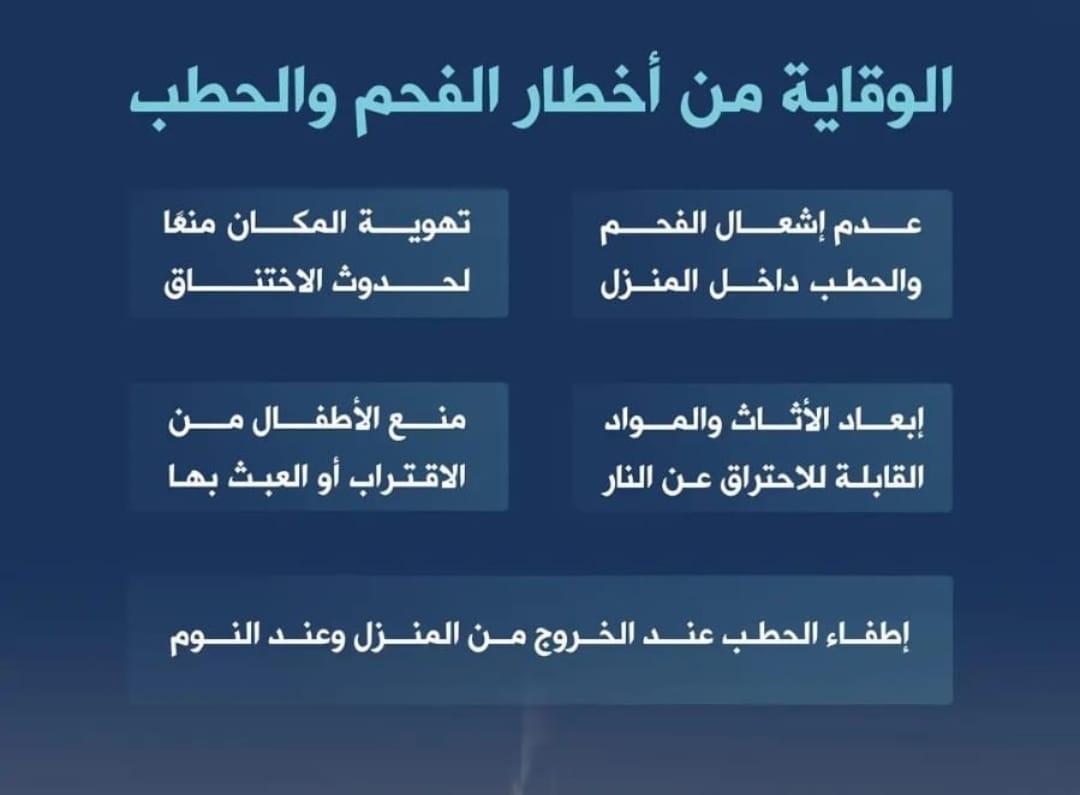 أكدت المديرية العامة للدفاع المدني ضرورة اتباع إرشادات وتعليمات السلامة عند استخدام الفحم والحطب للتدفئة، وشددت على أهمية إطفاء النار الناتجة عن الفحم والحطب عند الخروج من المنزل والحذر من النوم في أثناء اشتعالها؛ فاحتراقه ينتج غاز أول أكسيد الكربون، الذي يسبب الاختناق والموت -لا سمح الله- عند إشعالها في الأماكن المغلقة، وتنوه على مراقبة الأطفال ومنعهم من الاقتراب أو العبث بها.