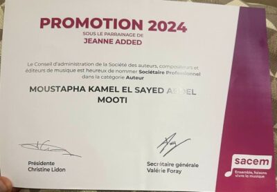 منحت جمعيّة المؤلّفين والملحنين وناشري الموسيقى الفرنسيّة “الساسيم” خطابات التهنئة للفنان مصطفى كامل نقيب المهن الموسيقية لإخطاره بإعتماده الرسمى ضمن محترفي العالم كشاعر وملحن مصري “العضوية البرفيشينال” حيث تخطت أعماله الناجحة الأف وثلاثمائة أغنية .