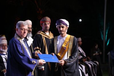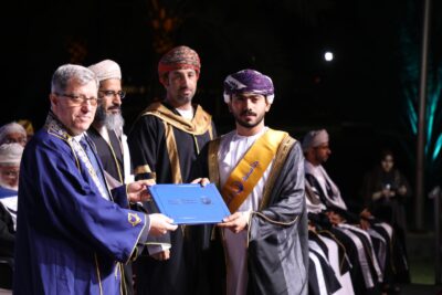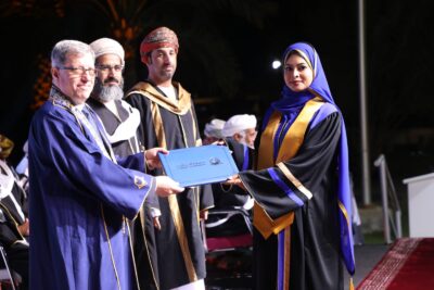 وأختتمت كلمتها بالقول : زملائي الخريجين والخريجات، لقد صنعنا هذا التخرج معا، وإن هذا اليوم ليس نهاية الطريق، بل هو البداية الفعلية لمسيرة البناء والعطاء. نحن اليوم نطوي صفحة من حياتنا كانت مليئة بالجهد والتحديات والطموحات ونستقبل مرحلة جديدة مليئة بالفرص وتحقيق الأحلام وها نحن اليوم نغادر هذا الصرح العظيم، نحمل في قلوبنا ذكرى جميلة، وفي عقولنا زاد العلم والمعرفة، وفي أرواحنا طموح يعانق عنان السماء. نعاهد الله ثم وطننا بأن نبقى أوفياء لرسالتنا، سفراء للعلم والعمل، عاملين بجد واجتهاد لرفعة هذا الوطن العظيم تحت ظل قيادته الحكيمة، داعين الله أن يحفظ عمان أرضا وقائدا وشعبا في خير وسلام وأمن وأمان على الدوام.