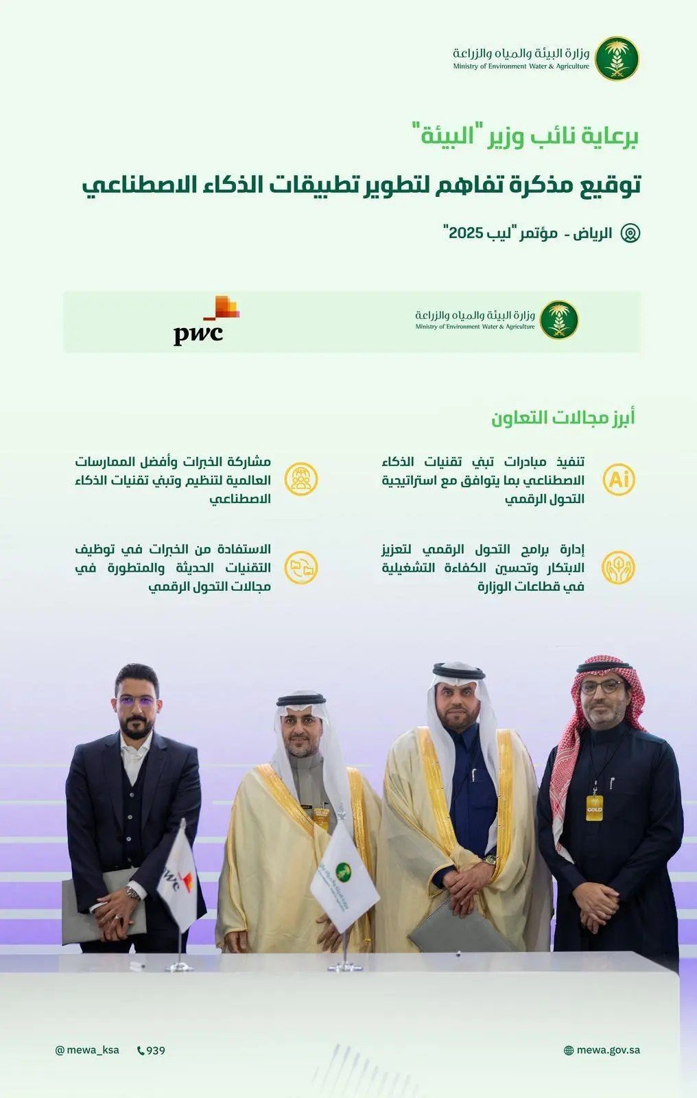 وقعت وزارة وزير البيئة والمياه والزراعة، مذكرة تفاهم مع شركة برايس ووترهاوس كوبرز للاستشارات المحدودة (PWC)، برعاية من معالي نائب وزير البيئة والمياه والزراعة المهندس منصور بن هلال المشيطي، وذلك ضمن مشاركتها في معرض ومؤتمر “ليب 25”.