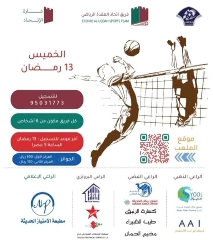 ينظم فريق اتحاد العقدة الرياضي الثقاقي التابع لنادي الشباب العماني الخميس المقبل ١٣ مارس ٢٠٢٥م مسابقة التحدي لبطولة الكرة الطائرة من خلال أمسية شارة الاتحاد الرمضانية لكرة الطائرة.