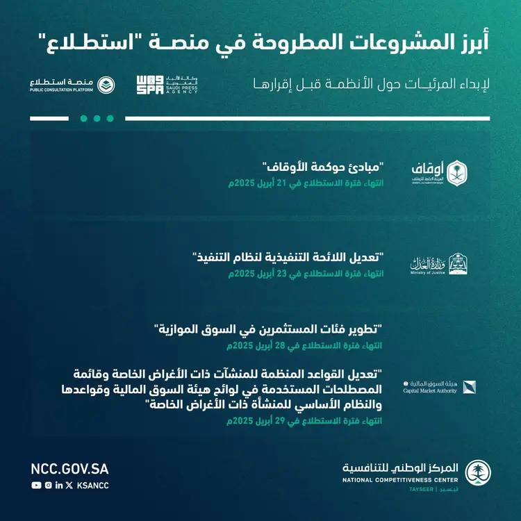 طرحت منصة “استطلاع” التابعة للمركز الوطني للتنافسية 27 مشروعًا ذا صلة بالشأن الاقتصادي والتنموي، بالتعاون مع 15 جهة حكومية؛ لتمكين العموم والجهات الحكومية والقطاع الخاص من إبداء المرئيات والمقترحات حولها قبل إقرارها.