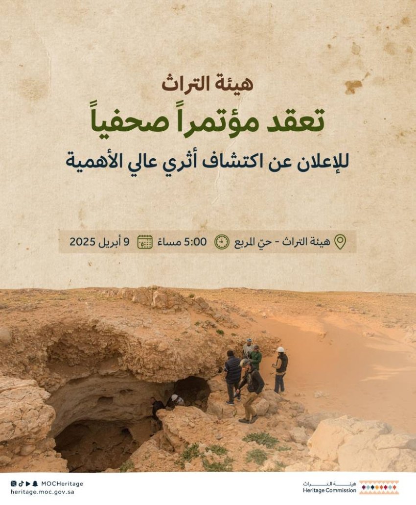 تعقد هيئة التراث مؤتمرًا صحفيًا غدًا بمقر الهيئة بحي المربع في العاصمة الرياض؛ للإعلان عن نتائج دراسة علمية حديثة، تتعلق بتاريخ الجزيرة العربية الخضراء.