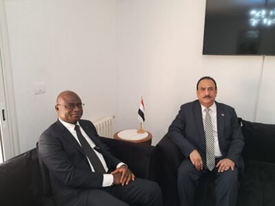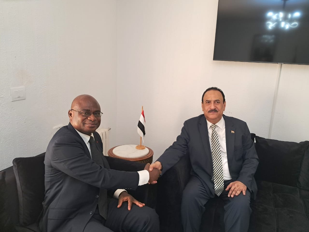 استقبل سعادة سفير الجمهورية اليمنية عميد السلك الدبلوماسي في تونس عبدالناصر باحبيب في مكتبه بمبنى السفارة صباح هذا اليوم الأربعاء 30 ابريل 2025 سعادة سفير جمهورية ساحل العاج الجديد المعتمد لدى تونس السيد نيامكي بنجامين مالن