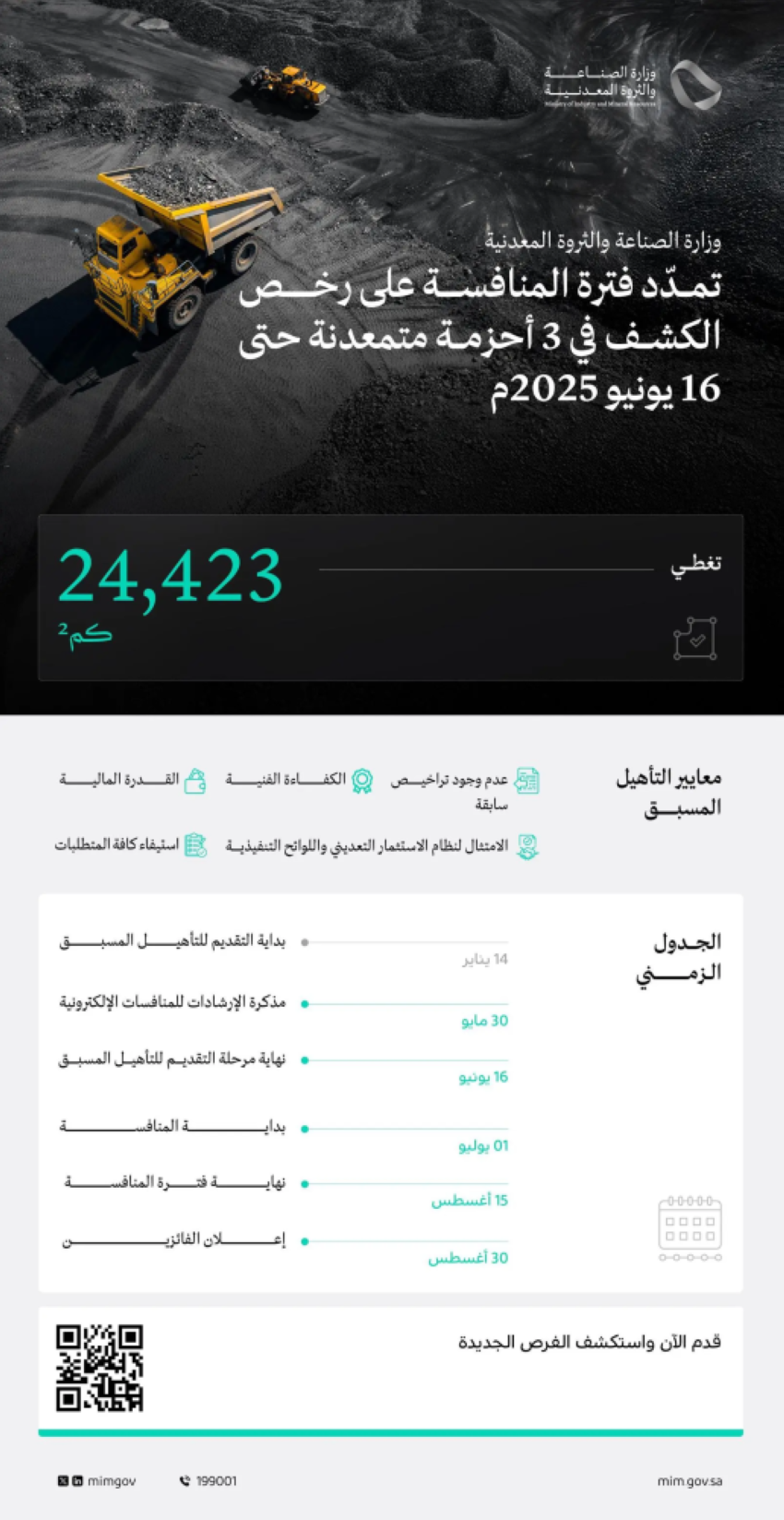 أعلنت وزارة الصناعة والثروة المعدنية، تمديد فترة استقبال طلبات التأهيل المسبق (PQQ) للمنافسة على رخص كشف لـ3 أحزمة متمعدنة حتى 16 يونيو 2025م؛ بهدف إتاحة المزيد من الوقت أمام الشركات المحلية والدولية لاستكمال متطلبات التأهيل، وتعزيز فرص المشاركة في ظل الإقبال المتزايد من المستثمرين.