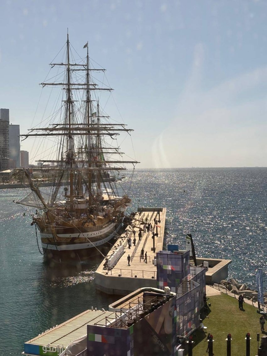 عقب ذلك، قدَّم قائد السفينة الكابتن جوزيبي لاي، نبذة عن التراث البحري للسفينة وتاريخها الطويل في الإبحار، مؤكدًا أهمية هذا الحدث في جذب الأنظار إلى جدة، التي تعد أحد المراكز السياحية المزدهرة بالمنطقة، ثم قام معاليه ووزير الدفاع الإيطالي بجولة على متن السفينة اطّلعا خلالها على معالمها الفريدة وتاريخها الممتد لأكثر من 93 عامًا.