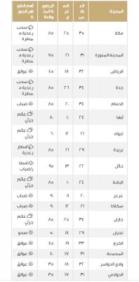 في حين تكون السماء غائمة جزئياً قد يتخللها سحب رعدية على أجزاء من مناطق الباحة، عسير وجازان. كما لا يستبعد تكون الضباب خلال الليل وساعات الصباح الباكر على أجزاء من مناطق (الحدود الشمالية ، الجوف، حائل، الشرقية )