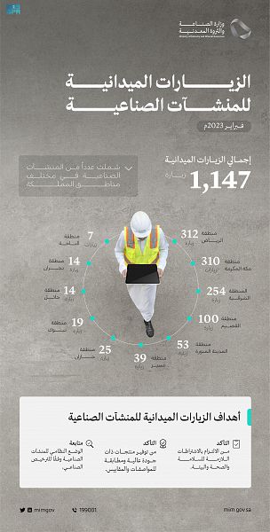 نفذت وزارة الصناعة والثروة المعدنية ممثلة في الإدارة العامة لمراكز الخدمة الشاملة الصناعية وإدارة الالتزام (1147) زيارة ميدانية على المنشآت الصناعية في عدد من مناطق المملكة خلال شهر فبراير الماضي؛ وذلك في إطار جولات الوزارة الدورية لمتابعة المصانع والوقوف على مدى جاهزيتها والتأكد من التزامها بتطبيق معايير الجودة والاشتراطات اللازمة.