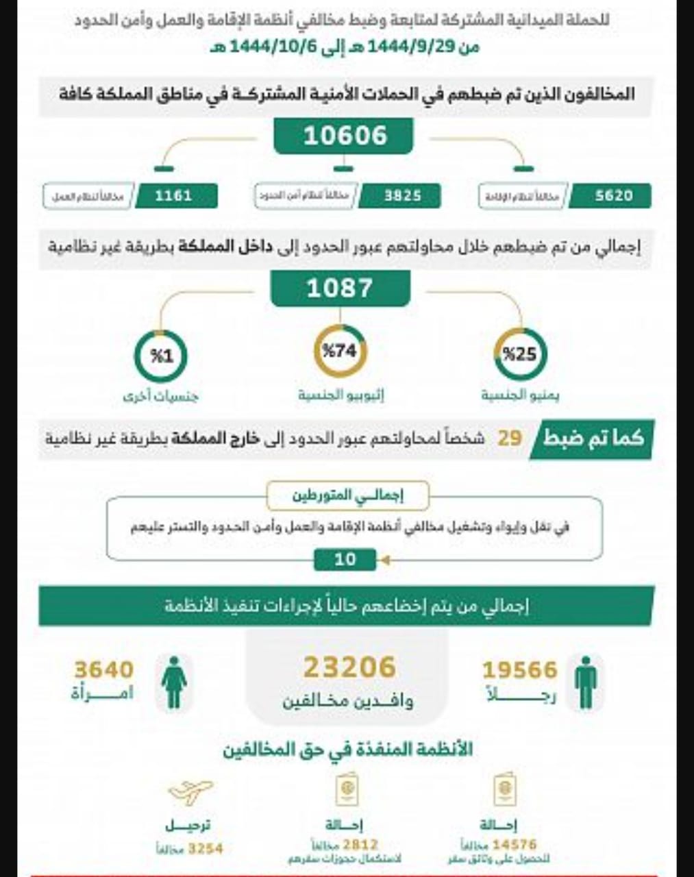 ضبط (10606) مخالفين لأنظمة الإقامة والعمل وأمن الحدود خلال أسبوع