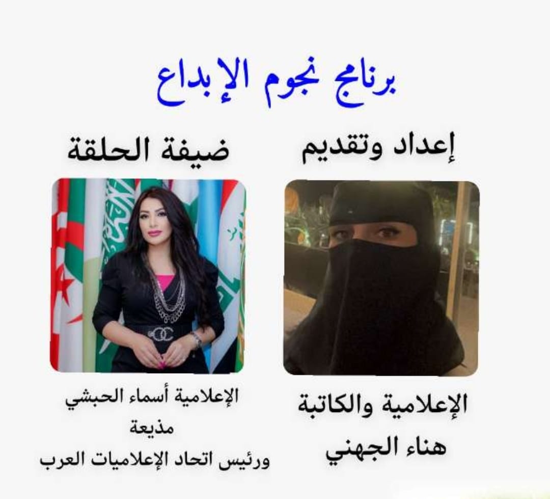 يستضيف برنامج نجوم الإبداع إعداد وتقديم الإعلامية والكاتبة هناء الجهني والذي يبث عبر التيك توك @hanaa1408 الإعلامية أسماء الحبشي مذيعة ورئيس اتحاد الإعلاميات العرب. يوم الخميس ٢٣ نوفمبر ٢٠٢٣م الساعة ٧م بتوقيت السعودية