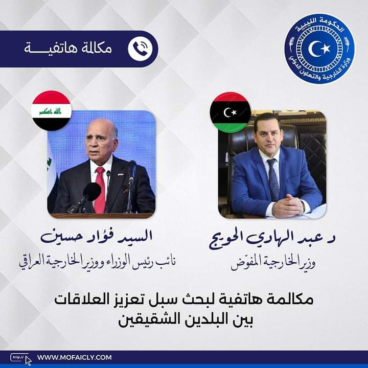 في إطار تعزير العلاقات العربية جرئ اتصال هاتفي بين الدكتور عبدالهادي الحويج وزير الخارجية بالحكومة الليبية المفوض الدكتور فؤاد حسين نائب رئيس مجلس الوزارء ووزير الخارجية بجمهورية العراق الشقيق تم خلاله بحت العلاقات الثنائية وتعزيز أطر التعاون بين البلدين الشقيقين في كافة المجالات المختلفة.
