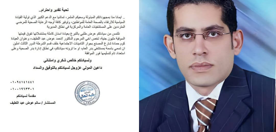 من جانبه، كان المستشار سالم عوض عبد اللطيف، نائب رئيس هيئة النيابة الإدارية وشقيق المرحوم الدكتور أحمد، قد تقدم بخطاب رسمي إلى وكيل وزارة الصحة بالبحيرة، معلنا عن رغبة الأسرة في التبرع بعيادة أسنان كاملة بكافة مشتملاتها، والتي تفوق قيمتها السوقية مليون جنيه، لتشغيلها في نطاق إدارة بدر الصحية.