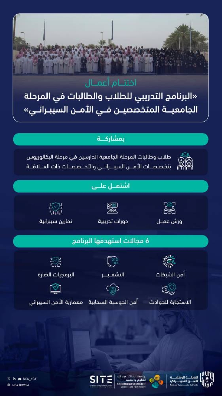 نفذت الهيئة الوطنية للأمن السيبراني “البرنامج التدريبي للطلاب والطالبات في المرحلة الجامعية المتخصصين في الأمن السيبراني” الذي أطلقته بالتعاون مع جامعة الملك عبدالله للعلوم والتقنية (كاوست) والذراع التقني للهيئة الشركة السعودية لتقنية المعلومات (سايت).