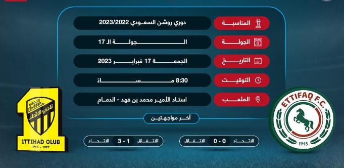 يحل الفريق الأول لكرة القدم بنادي الاتحاد اليوم الخميس ضيفا على نظيره الاتفاق في مباراة لحساب الجولة 17 من دوري روشن 22/23 .