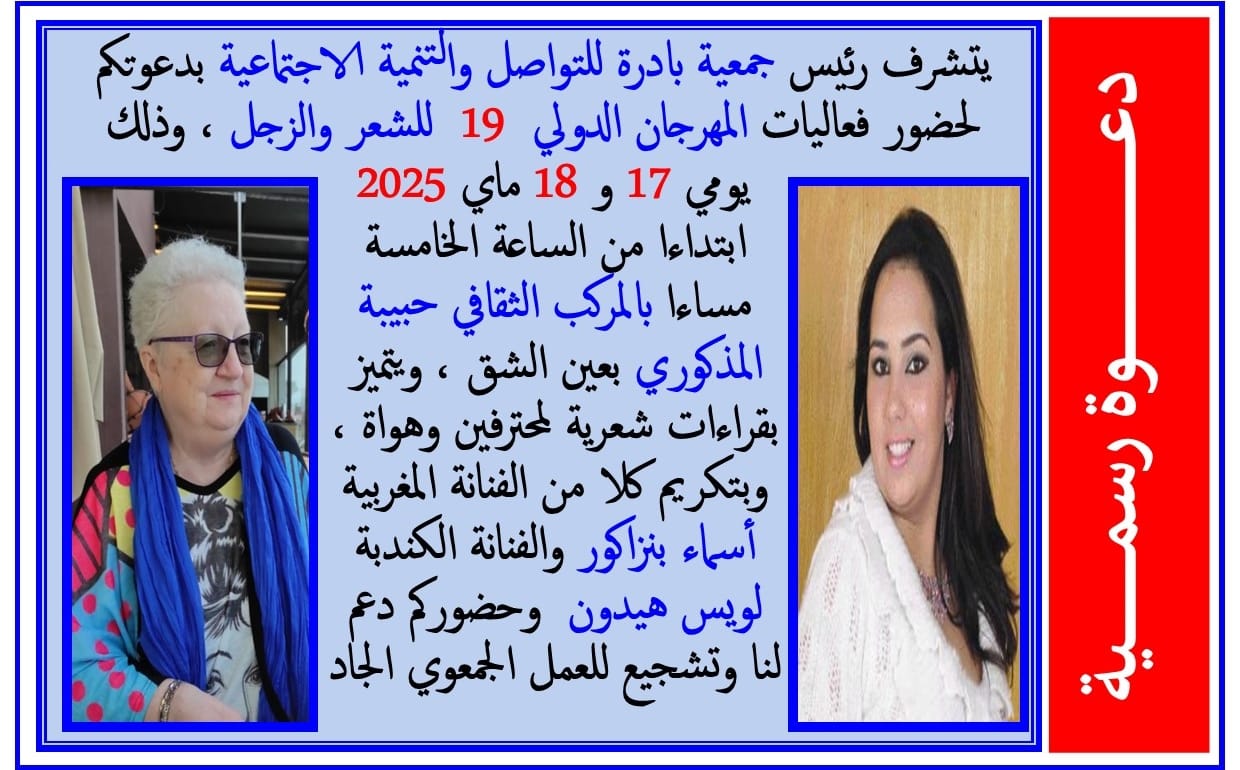 وتخبر إدارة الجمعية المنظمة كافة الشعراء والزجالين أن باب المشاركة مازال مفتوحا ، كما تمنحهم فرصة المشاركة في ديوان شعري جماعي مشترك تصدره جمعية بادرة كل سنة وقد وصل هذا العام لإصداره الخامس عشر .