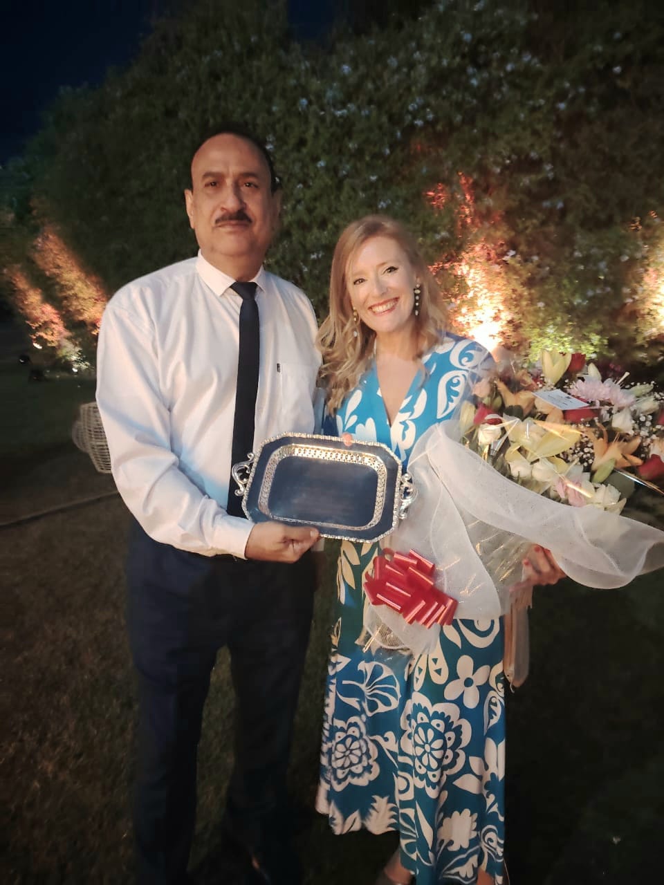 كرم يوم أمس الجمعة 16اغسطس2024 سفير الجمهورية اليمنية وعميد السلك الدبلوماسي بتونس عبدالناصر باحبيب السيدة هيلين ونترتون سفيرة المملكة المتحدة بهدية تذكارية بمناسبة انتهاء مهام عملها في تونس…مشيدا بالجهود الطيبة التي بذلتها سعادة السفيرة في تحسين وتطوير العلاقات بين المملكة المتحدة والجمهورية التونسية ، وذلك في الحفل الرفيع الذي اقيم بهذه المناسبة،متمنيا لسعادتها كل التوفيق والنجاح في مهامها المستقبلية وحياتها الخاصة…