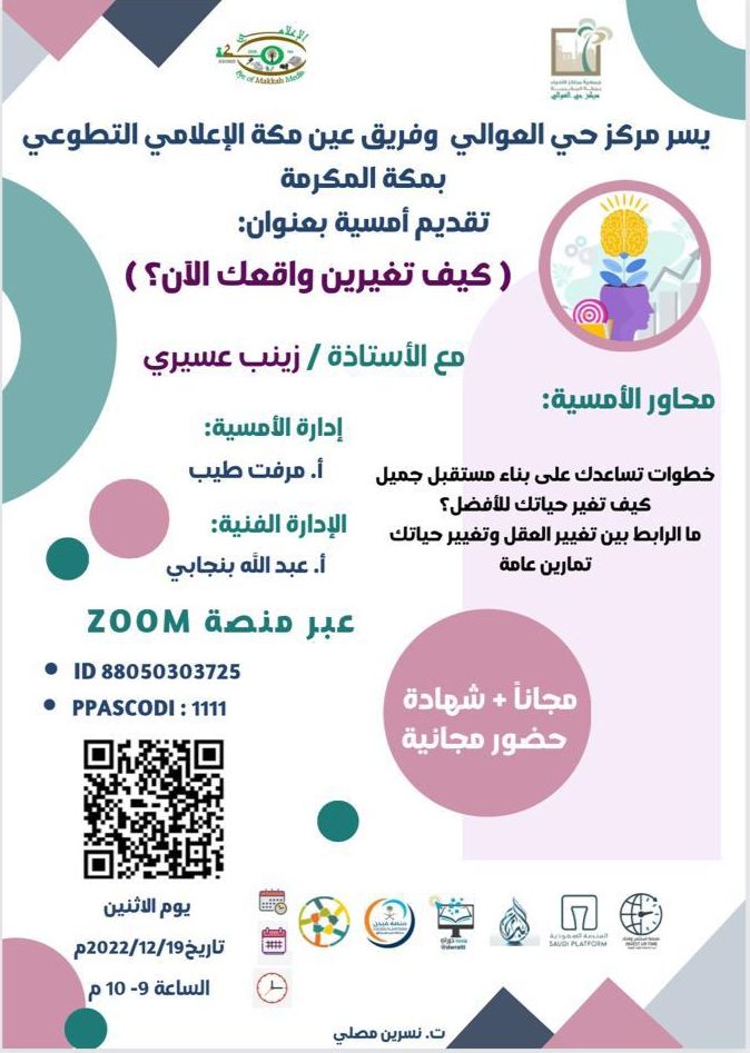 يقدم مركز حي العوالي وفريق عين مكة الإعلامي التطوعي التابعين لجمعية مراكز الاحياء بمكة المكرمة أمسية عن بعد بعنوان كيف تغيرين واقعك الآن ؟ .